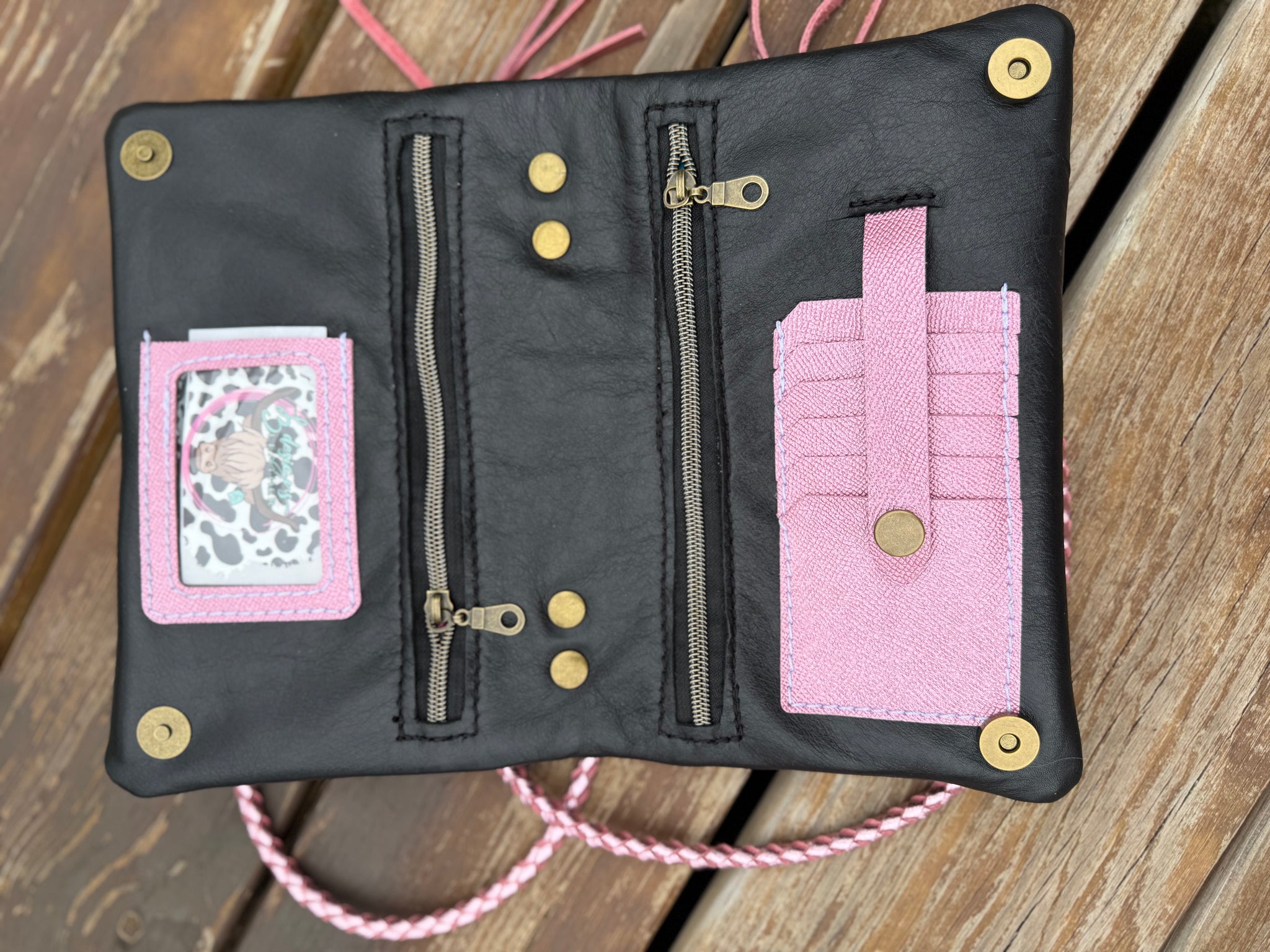 she has three zippered compartments, five card slots locked in with a button snap, and a ID slot! You can add a crossbody strap and turn her into a purse or use her as a large wallet to fit inside your large bags!