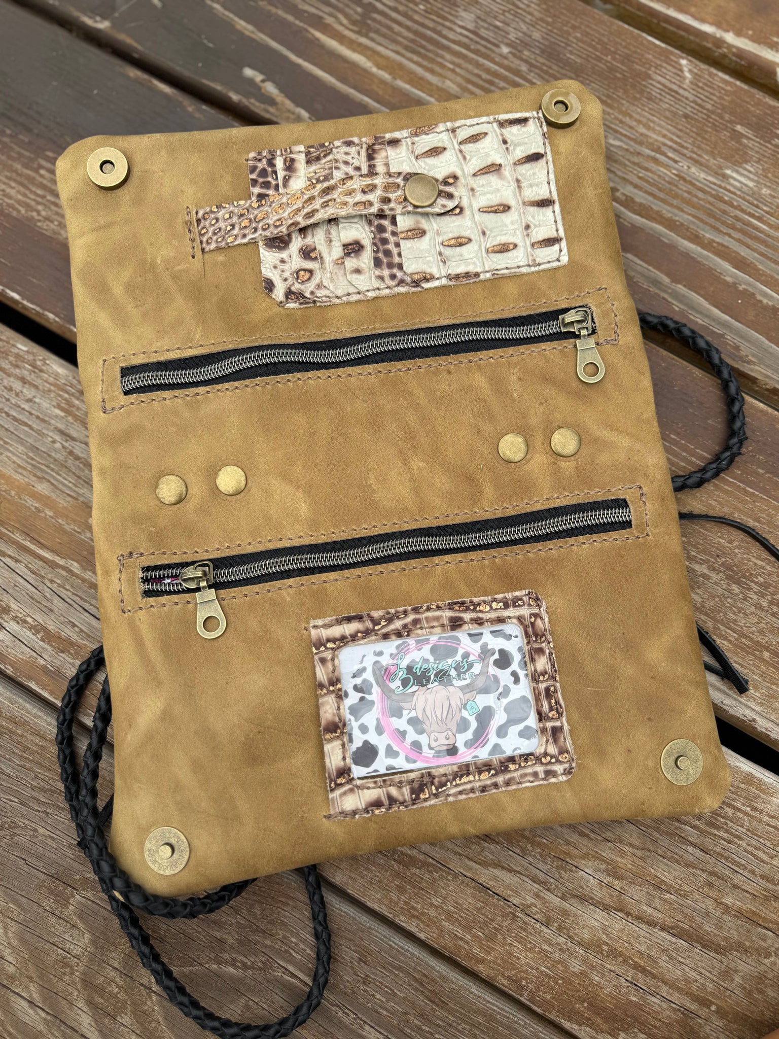 she has three zippered compartments, five card slots locked in with a button snap, and a ID slot! You can add a crossbody strap and turn her into a purse or use her as a large wallet to fit inside your large bags!