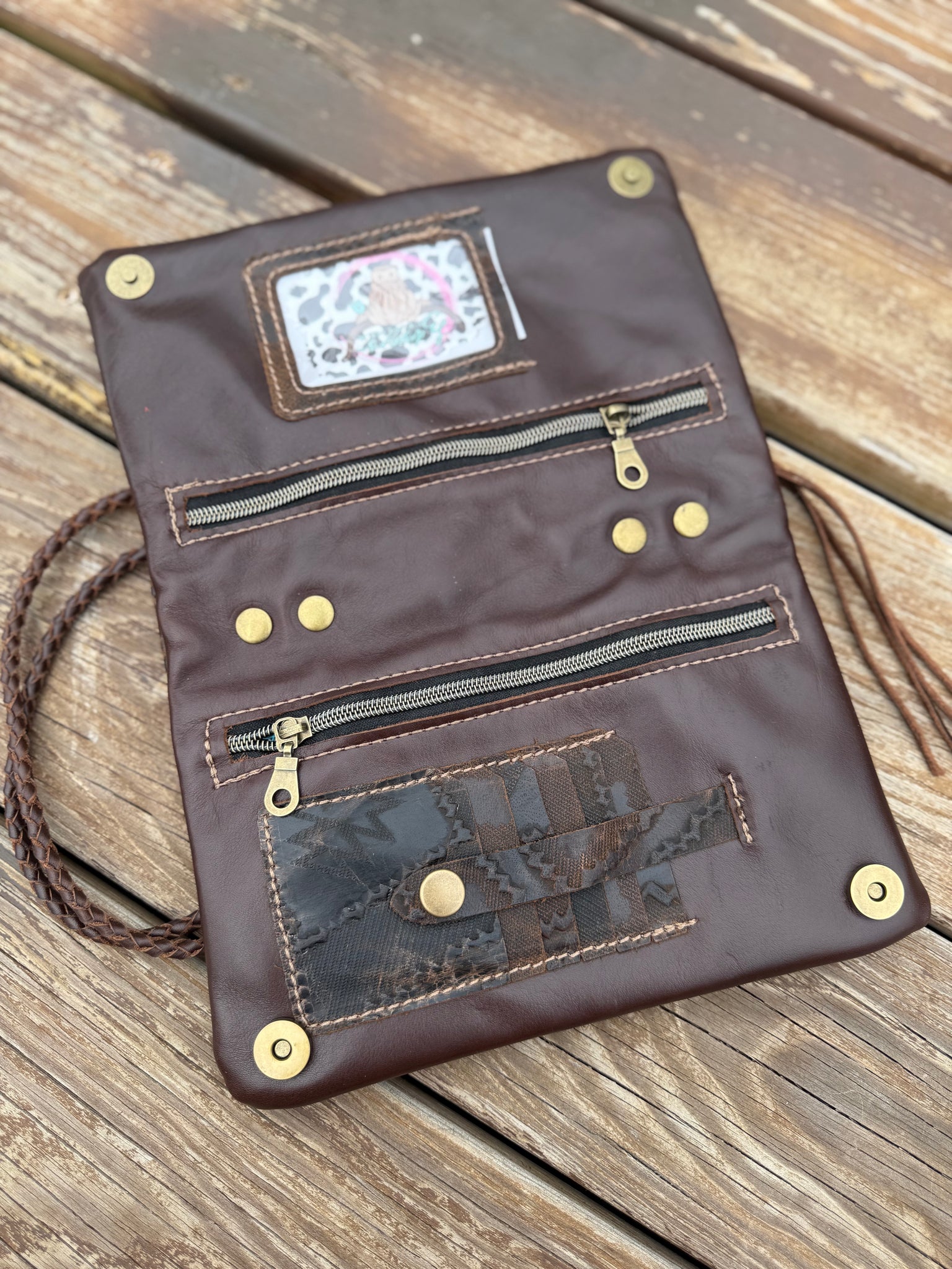 she has three zippered compartments, five card slots locked in with a button snap, and a ID slot! You can add a crossbody strap and turn her into a purse or use her as a large wallet to fit inside your large bags!