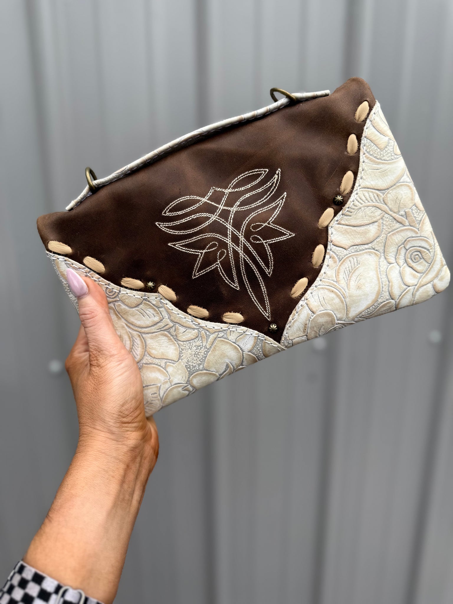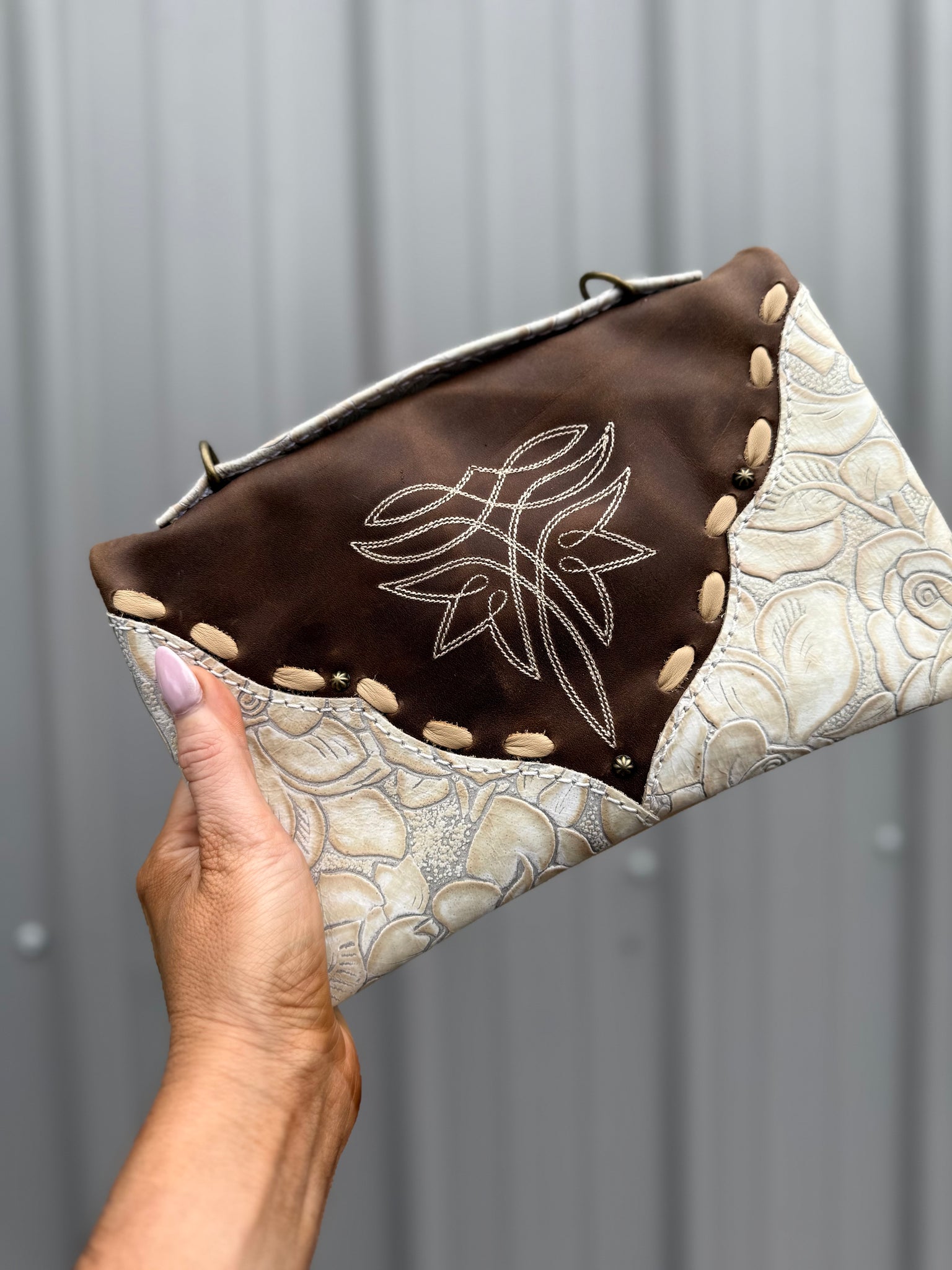 she has three zippered compartments, five card slots locked in with a button snap, and a ID slot! You can add a crossbody strap and turn her into a purse or use her as a large wallet to fit inside your large bags!