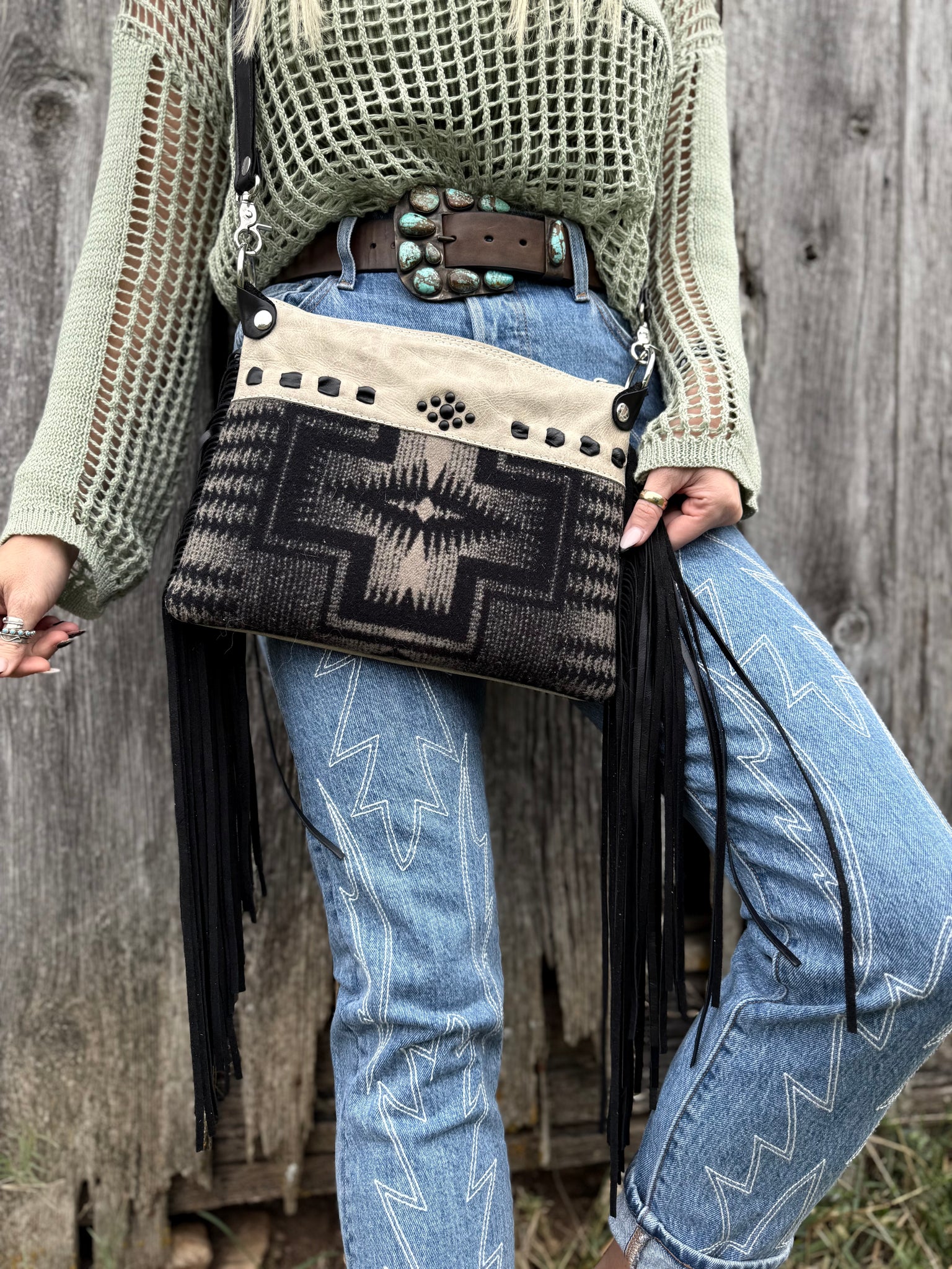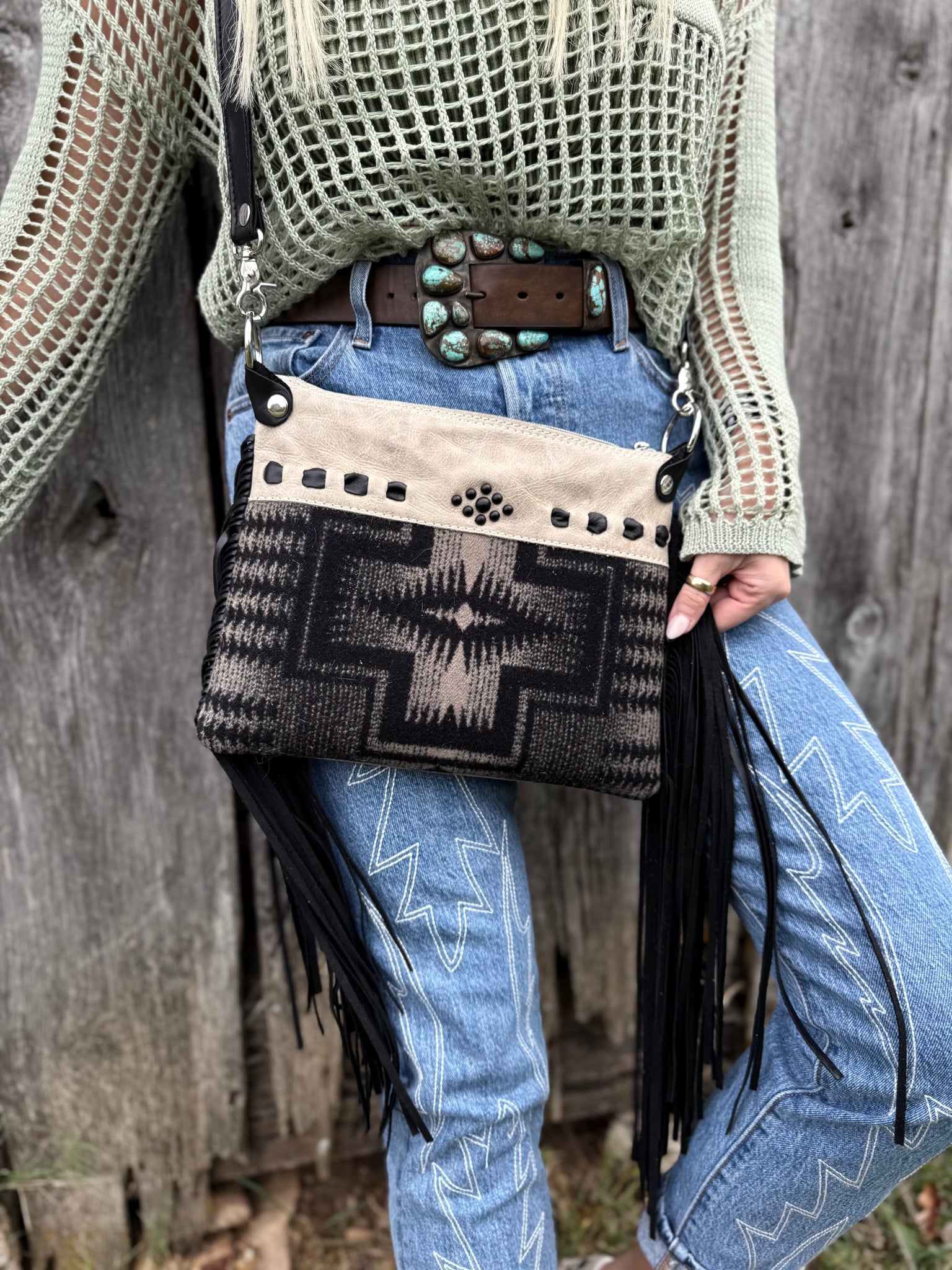 Need a bag that can carry the essentials and easy to pick up and go. We have that for you. Our  crossbody can carry your lipstick, phone, wallet and touch-up make up. Each bag is lined with a colorful cotton fabric to give it the perfect personality.  It is a zipper closure bag so nothing will spill out.  All Products are made with Genuine Italian Leather & Premium Cowhide. This one is super unique to the fact that it is reversible! Ivory Cowboy Tool on one side, and Lace Underlay Cowhide on the reverse! You can choose to wear it whatever way you want per your outfit!