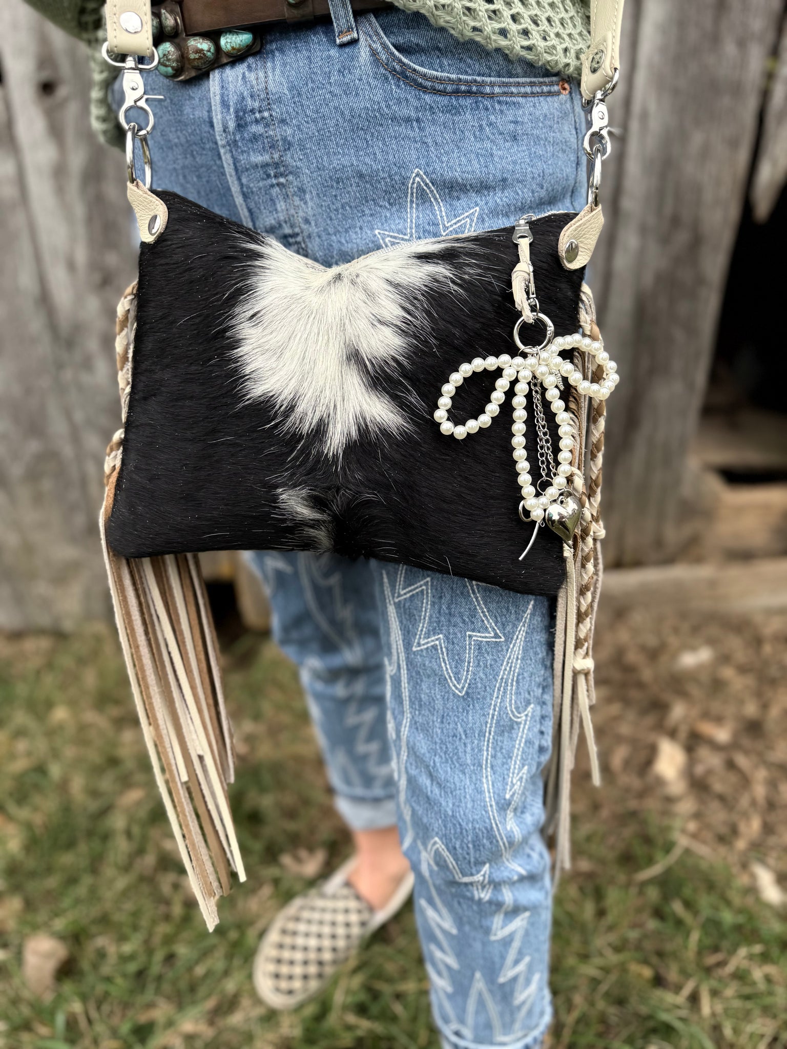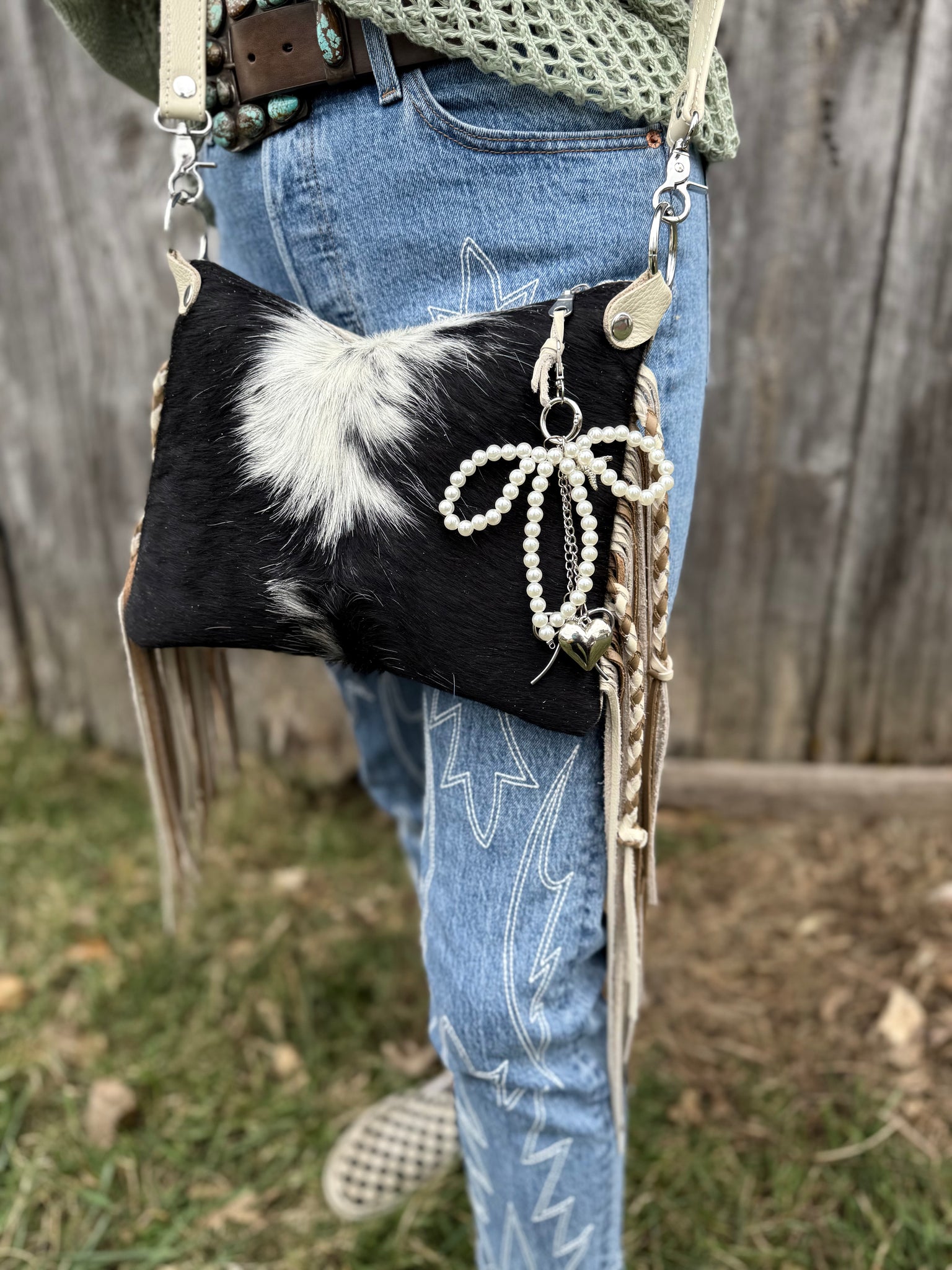 Need a bag that can carry the essentials and easy to pick up and go. We have that for you. Our  crossbody can carry your lipstick, phone, wallet and touch-up make up. Each bag is lined with a colorful cotton fabric to give it the perfect personality.  It is a zipper closure bag so nothing will spill out.  All Products are made with Genuine Italian Leather & Premium Cowhide. This one is super unique to the fact that it is reversible! Ivory Cowboy Tool on one side, and Lace Underlay Cowhide on the reverse! You can choose to wear it whatever way you want per your outfit!
