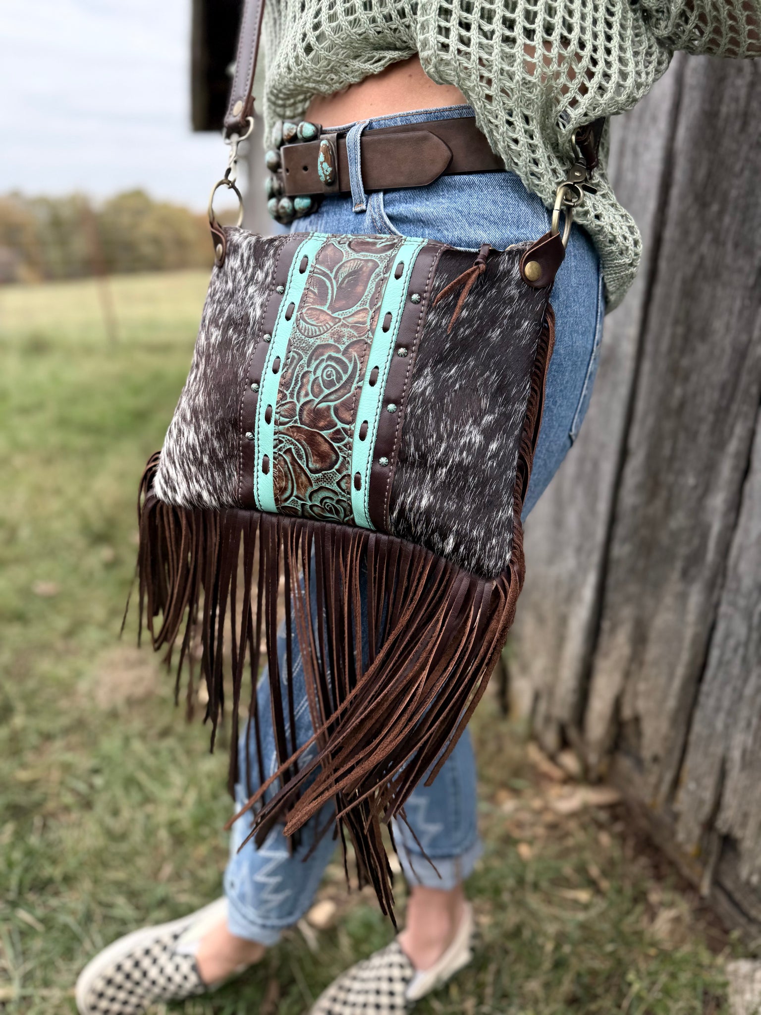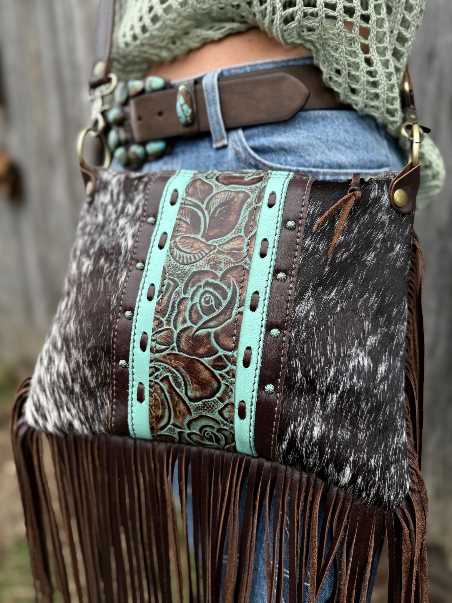 Need a bag that can carry the essentials and easy to pick up and go. We have that for you. Our  crossbody can carry your lipstick, phone, wallet and touch-up make up. Each bag is lined with a colorful cotton fabric to give it the perfect personality.  It is a zipper closure bag so nothing will spill out.  All Products are made with Genuine Italian Leather & Premium Cowhide. This one is super unique to the fact that it is reversible! Ivory Cowboy Tool on one side, and Lace Underlay Cowhide on the reverse! You can choose to wear it whatever way you want per your outfit!