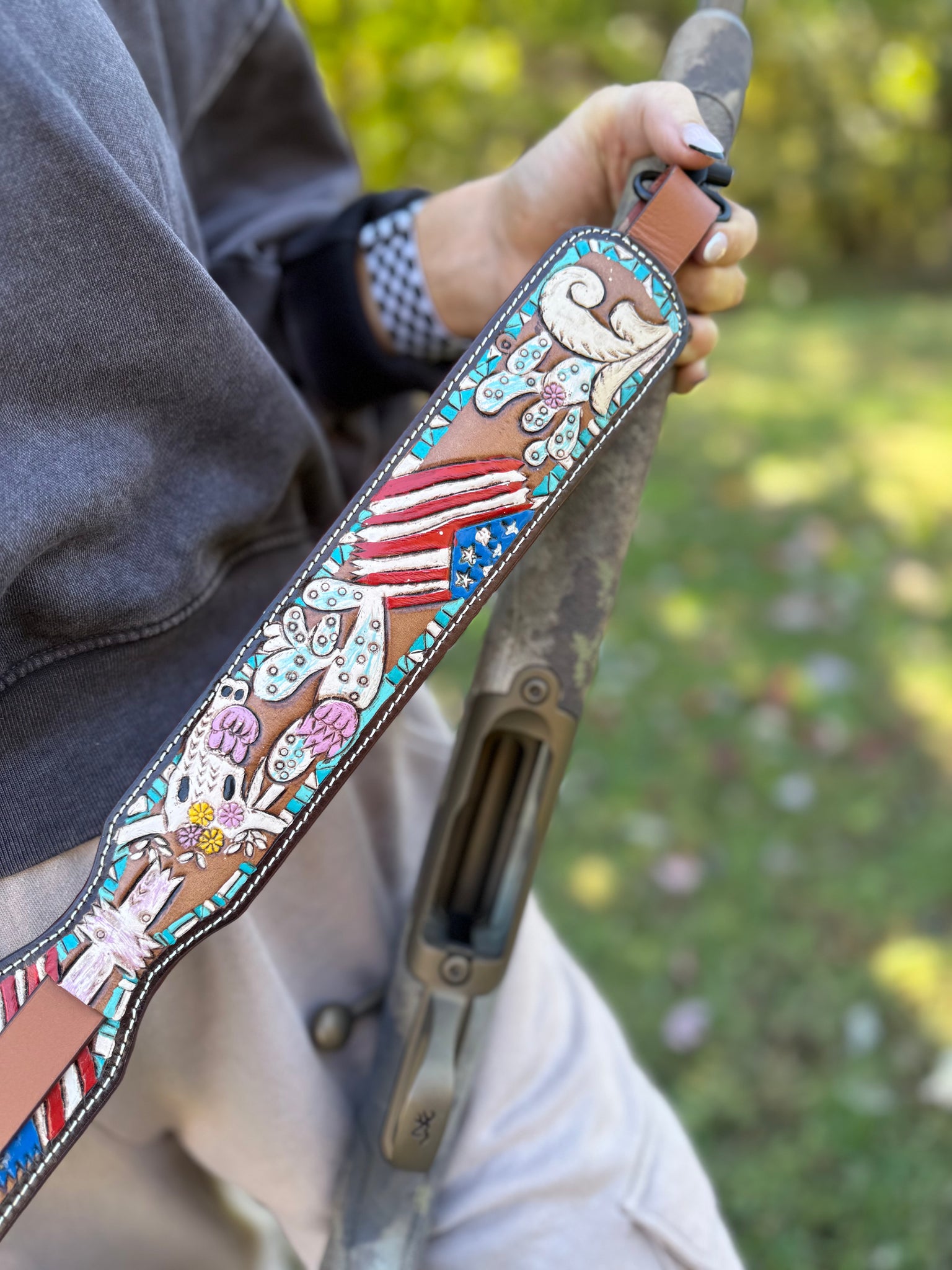 Our hand-tooled rifle sling is designed for hunters who demand performance and style. Each sling features a bright, bold tooled pattern in feminine color palettes (on top-quality leather that wears in beautifully. The low-friction sliding glider lets you lengthen the sling a few inches instantly for shoulder-to-shoulder carry or a quick swing into shooting position. Solid metal quick-attach clips hook to your rifle’s sling mounts securely, and reinforced stitching ensures this sling holds up on long trips and rough days in the field.