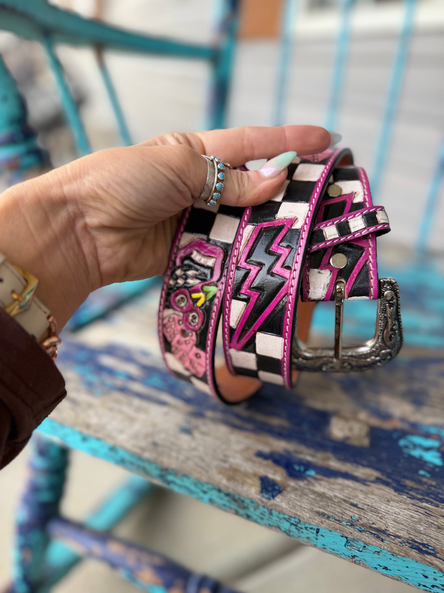 Hand-Tooled Leather Belt – White Flower