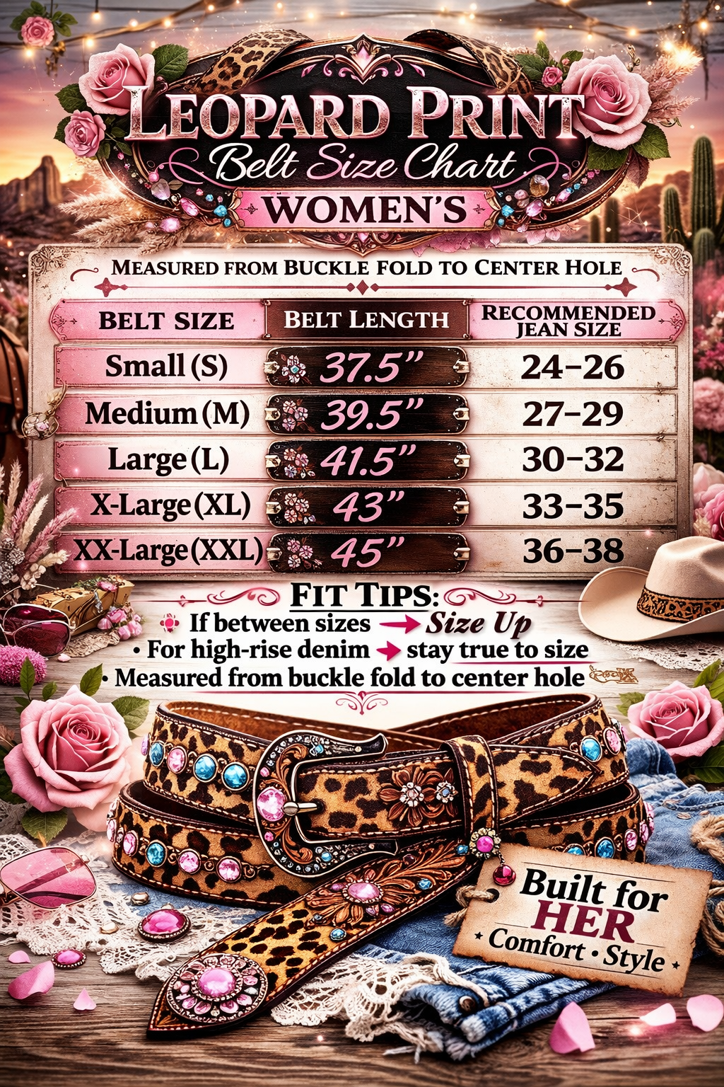 Sizing: Measured from buckle fold to center hole. Please see our size chart for best fit.