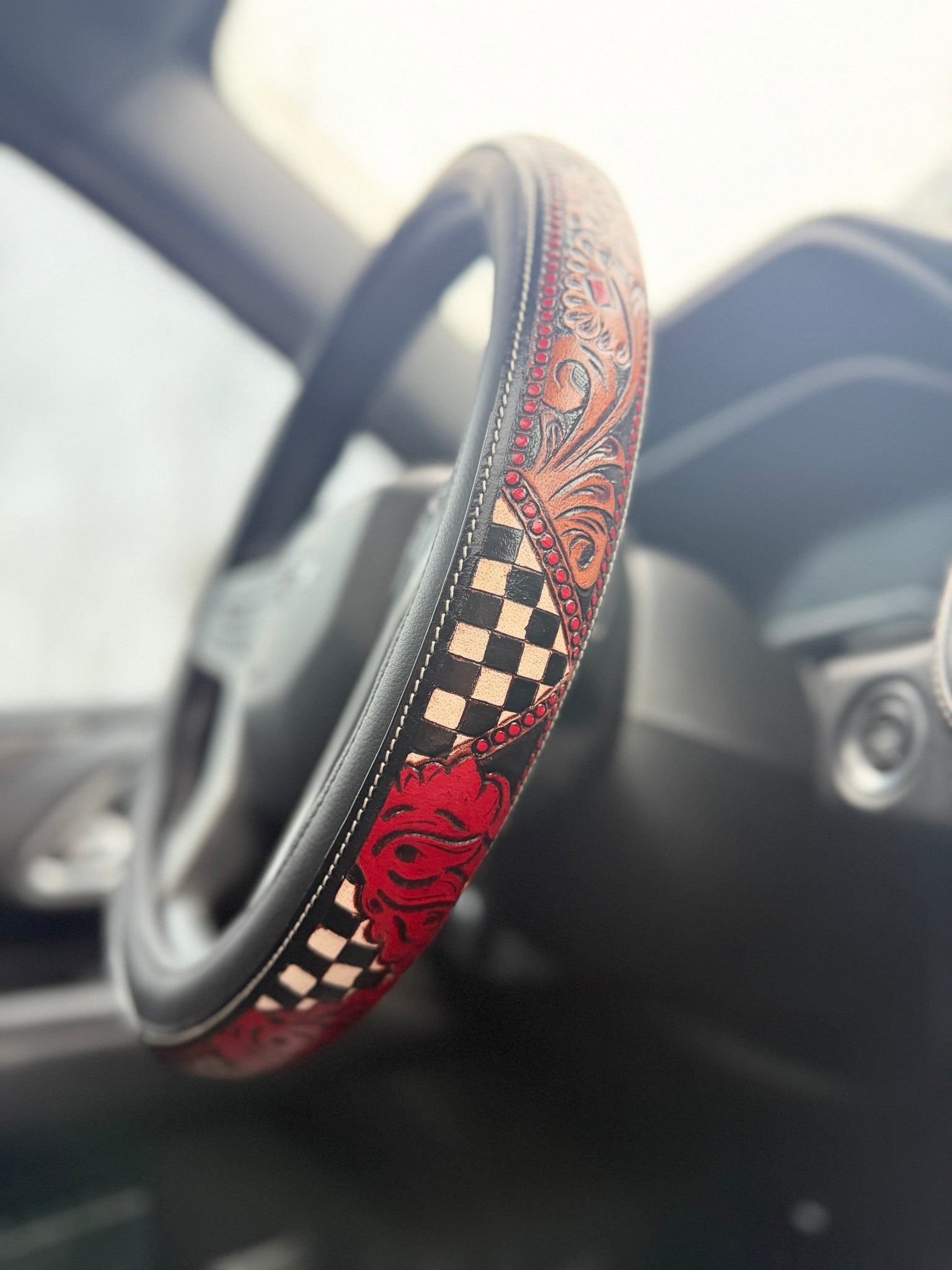 These are not your average steering wheel covers — each one is hand-tooled, hand-painted, and made from genuine leather. 🤎