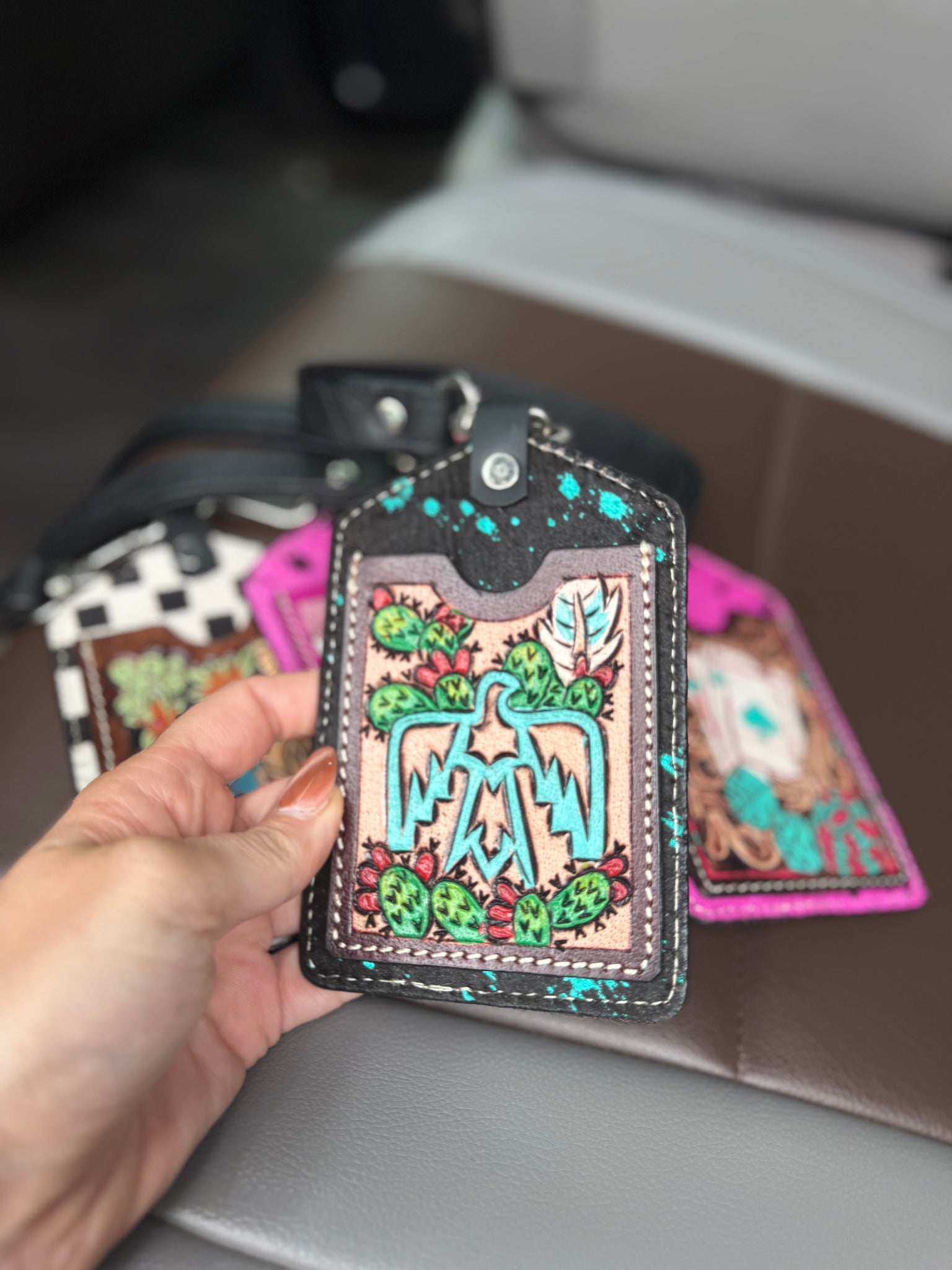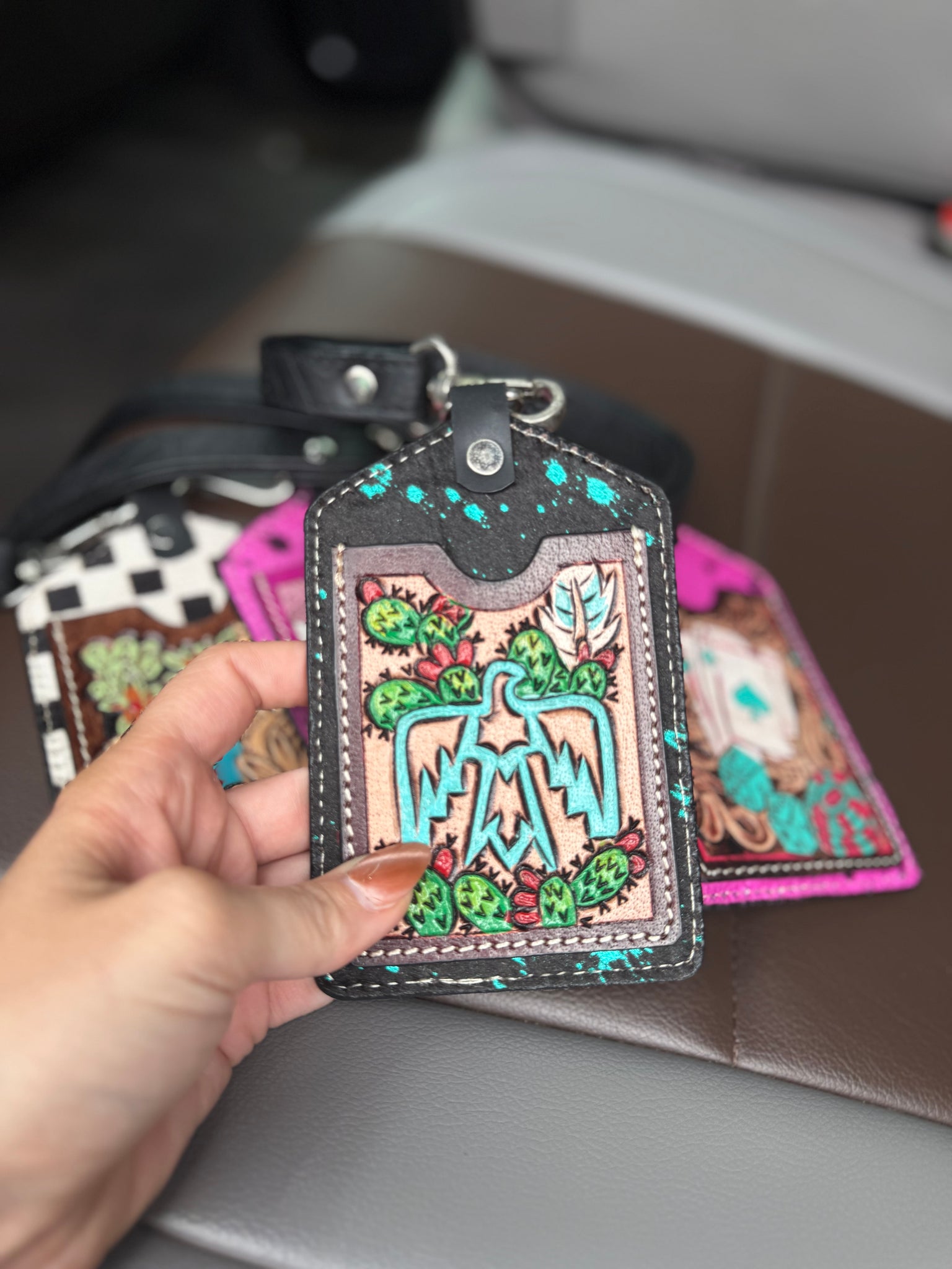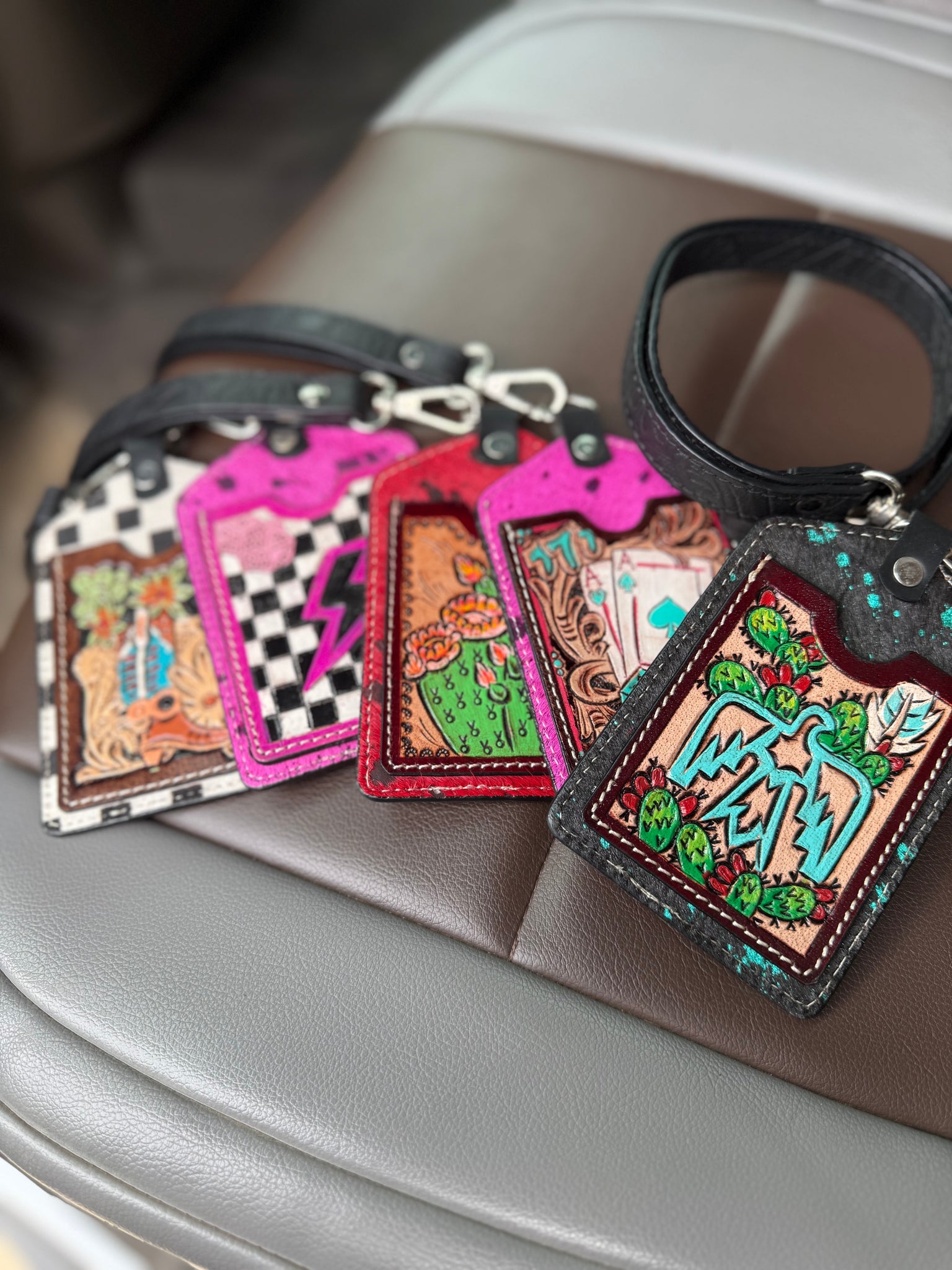 Carry your essentials in style with these handcrafted leather lanyards! Each one features a bold, eye-catching design on genuine cowhide, paired with tooled leather accents that make each piece totally unique.